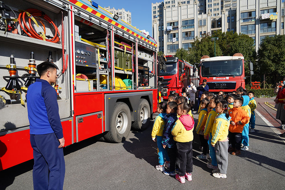 当天9点左右,两辆幼儿园校车缓缓驶入居巢消防救援站,小朋友们在老师的带领下好奇地走近消防车。“小朋友们,你们知道这是什么吗?这是消防车里面的发电机。这个云台能升多高,你们猜一猜……”该消防救援站二班班长卢等等耐心地跟小朋友们进行互动,用小朋友们喜欢的方式跟他们讲解一些消防安全方面的知识。